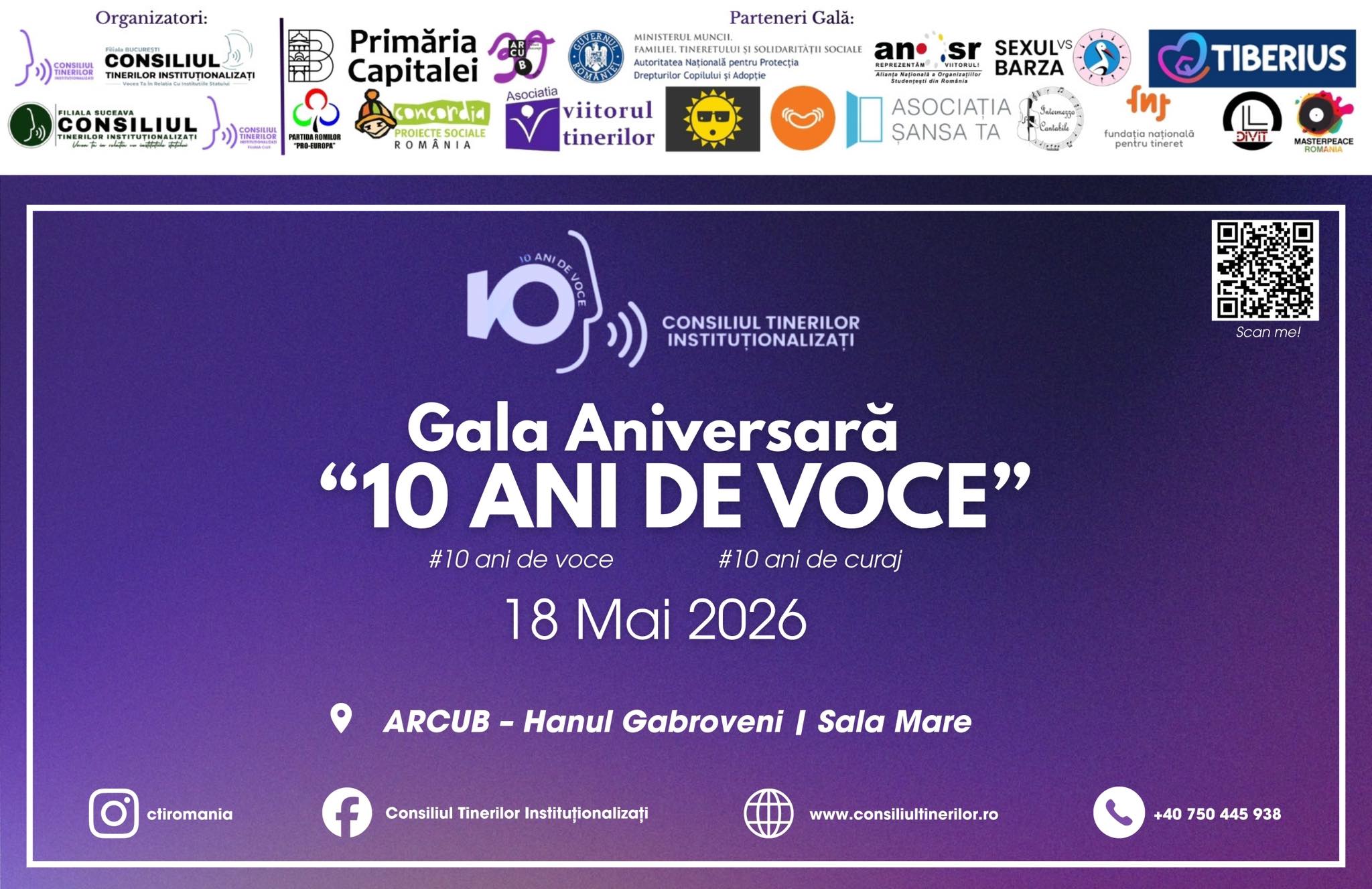 Consiliul Tinerilor Instituționalizați are plăcerea de a anunța organizarea Galei Aniversare - “10 ani de Voce”.